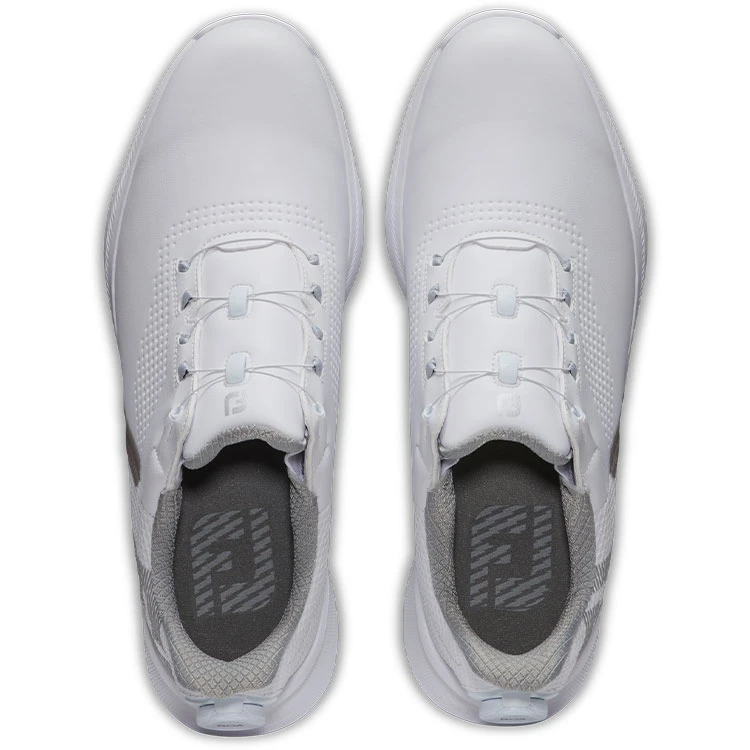 | FootJoy Fuel BOA 55446 Golf Shoes Precision Fitting With BOA Lace System Introducing the new Fuel BOA golf shoes from FootJoy. The players spikeless shoe that combines a streamlined waterproof synthetic upper with a mid-foot bevel and exaggerated platform for a modern and athletic silhouette. Below the silhouette, a combination of the sole – inspired by a Pro SL Outsole – patented mid-foot stability bridge, and Stratolite EVA midsole, revolutionises athletic performance with Tour-proven traction and stability through the swing. 100% waterproof, the synthetic upper is easy to clean with 1 year waterproof protection. The new BOA & Power Harness Custom Fitting Lacing System provides exceptional fit and is easily altered during the round and throughout the life of the shoes. Experience the ultimate in platform stability and athletic styling from the #1 Shoe In Golf. |