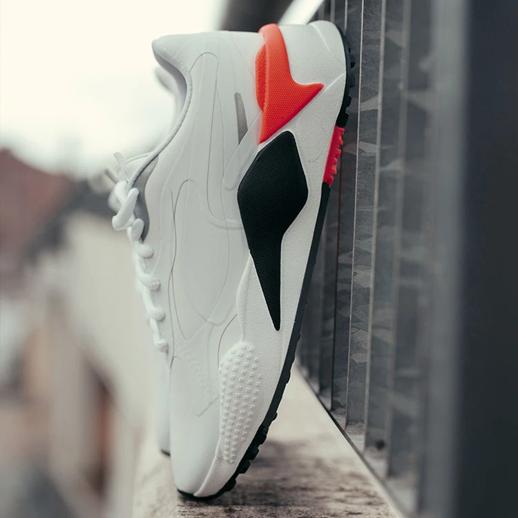 | Puma RS-G Golf Shoes Mixing 80s Retro With Sporting Innovations Puma Golf, long revered as a trend-setter and innovator in the golf footwear space, continues to push the envelope, with its new RS-G shoe. Inspired by Puma’s extremely popular RS series of shoes first introduced in the 80s and recently rebooted with multiple drops in 2019 and 2020, the RS-G delivers unconventional, lifestyle-inspired vibes with all the performance technologies needed to play 18. Incorporating the same, bold, chunky silhouette as the sportstyle version, the RS-Gs reengineered upper is seam-sealed and completely waterproof, with microfiber leather and TPU skin that delivers protection from the elements, keeping your feet dry all day long. The outsole traction pattern has exaggerated and pronounced Carbon Rubber lugs strategically placed in different zones of the outsole to provide traction while the performance Fusion Foam midsole delivers improved, bounce-back cushioning combined with a Softfoam sockliner for the ultimate step-in comfort. These stylish shoes bring retro running vibes to the links. Break tradition with the new Puma RS-G Golf Shoes. |